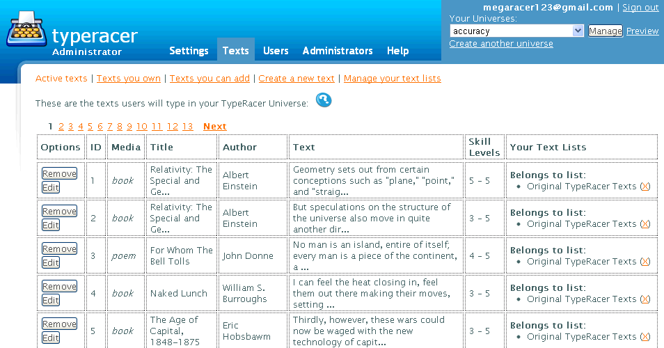 • Hey Sean, it will be pretty easy for me to put quotes from other universes into the main rotation. Six hundred is not enough, I agree, and that’s part of the reason I want people to create their own universes – to share the burden of entering new texts. About the skill levels – texts are roughly segmented by length, depending on skill level (the idea is to not make a beginner have to type one quote for 5 minutes).