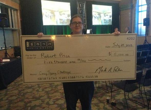 In the first round of the contest, notable Typeracer user Sean Wrona (his Typeracer profile; his website) came in first place, typing 173wpm on a standard Qwerty keyboard (he dropped out later in the contest); Robert came in second. In the final round, typists were required to type on a new kind of mobile keyboard called the TREWGrip. They were given 5 days to practice. In this final round, and Robert came in first place–taking home a $5000 check!