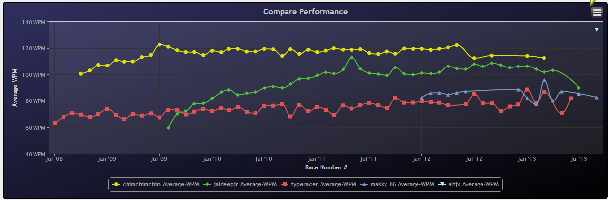 Hi Typeracers! Recently I’ve been in touch with Typeracer’s very own Makky (makky_86) (all links open a new window), a Megaracer from the UK who has been developing a new tool to analyze Typeracer data, create cool charts, etc.  His app is still under development; he’s still working on new features, improving stability/removing bugs, etc. My favorite feature on Makky’s “Typeracer Web App” is the ability to create graphs comparing different users and their race histories.