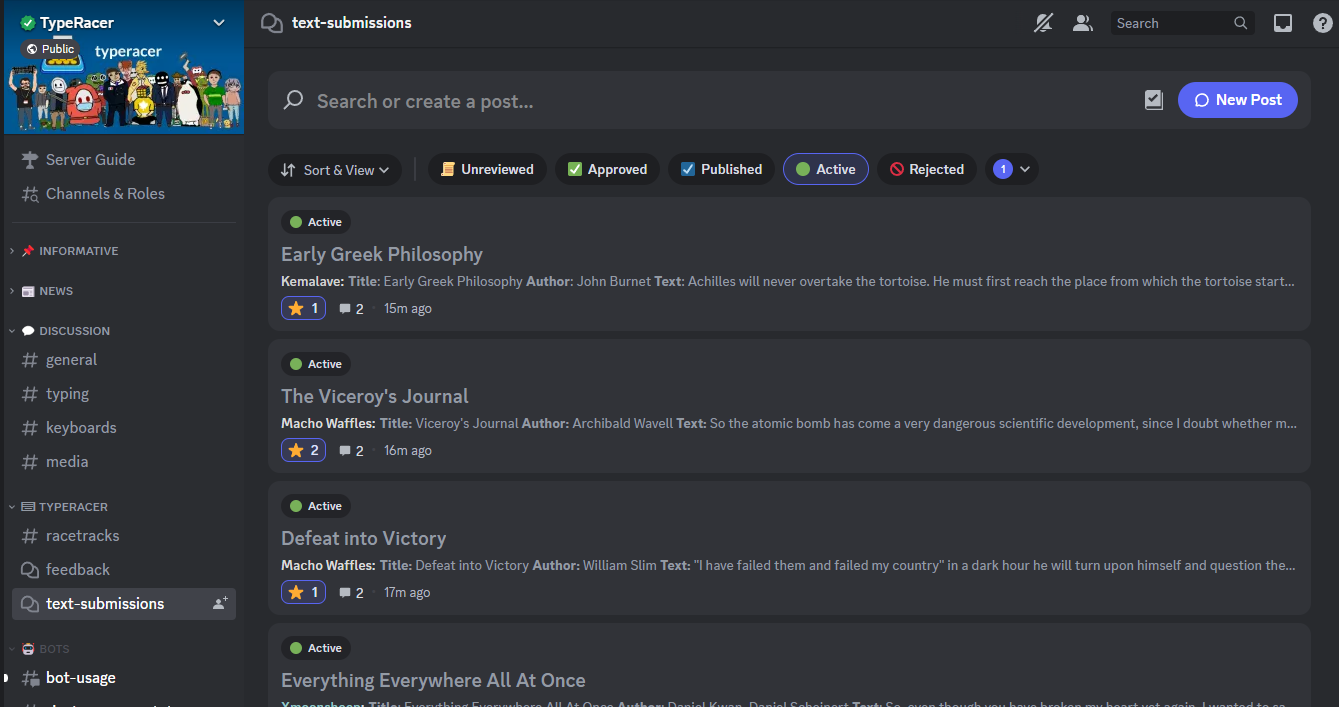 ✨ Ever wanted to race your own texts on TypeRacer? Join the Discord and submit your favorite texts!